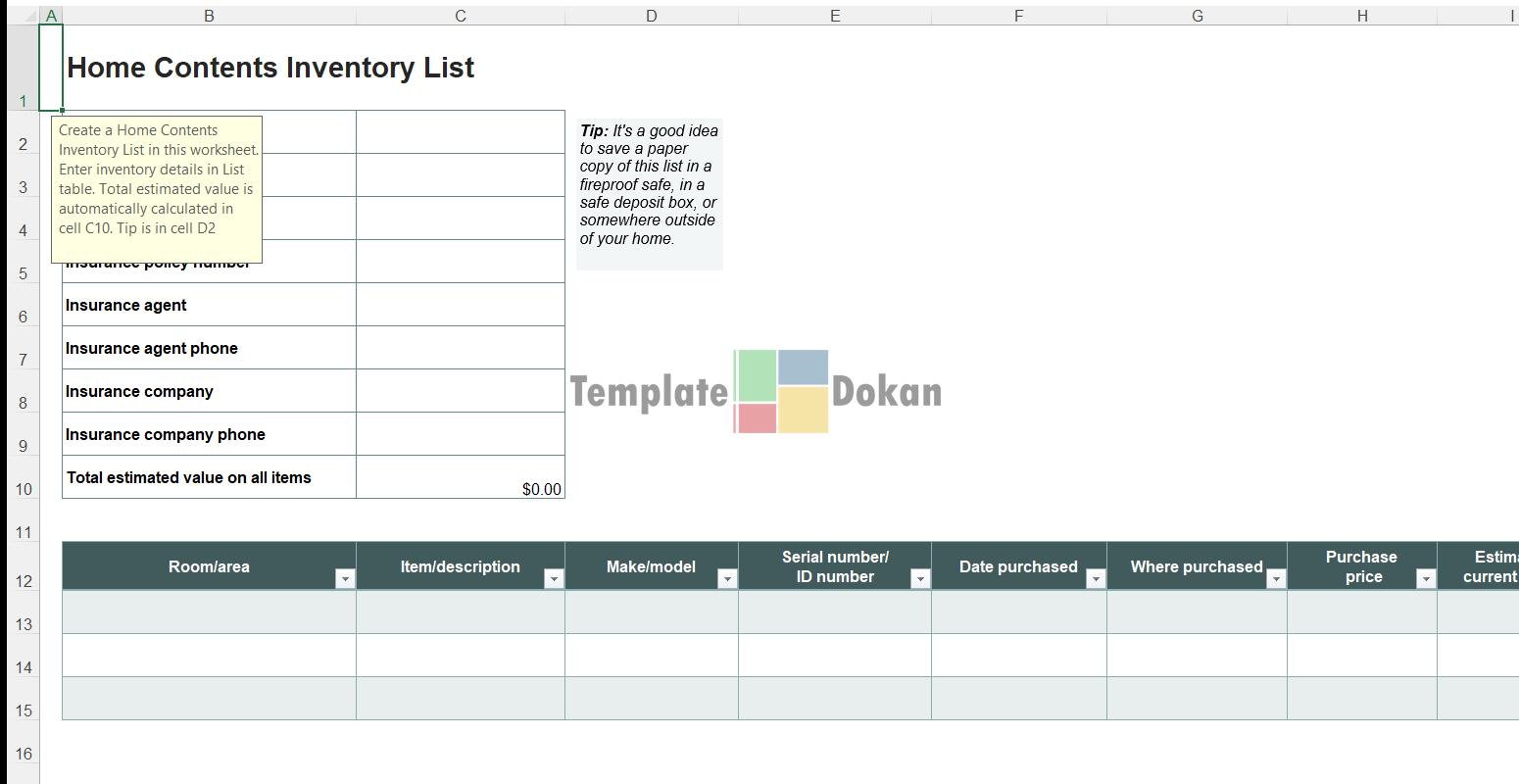 The Home Contents Inventory List is a fully customizable and editable Excel template. Perfect for professionals, students, or personal use, this template helps you stay organized and efficient. Easily printable and compatible with all modern versions of Excel.