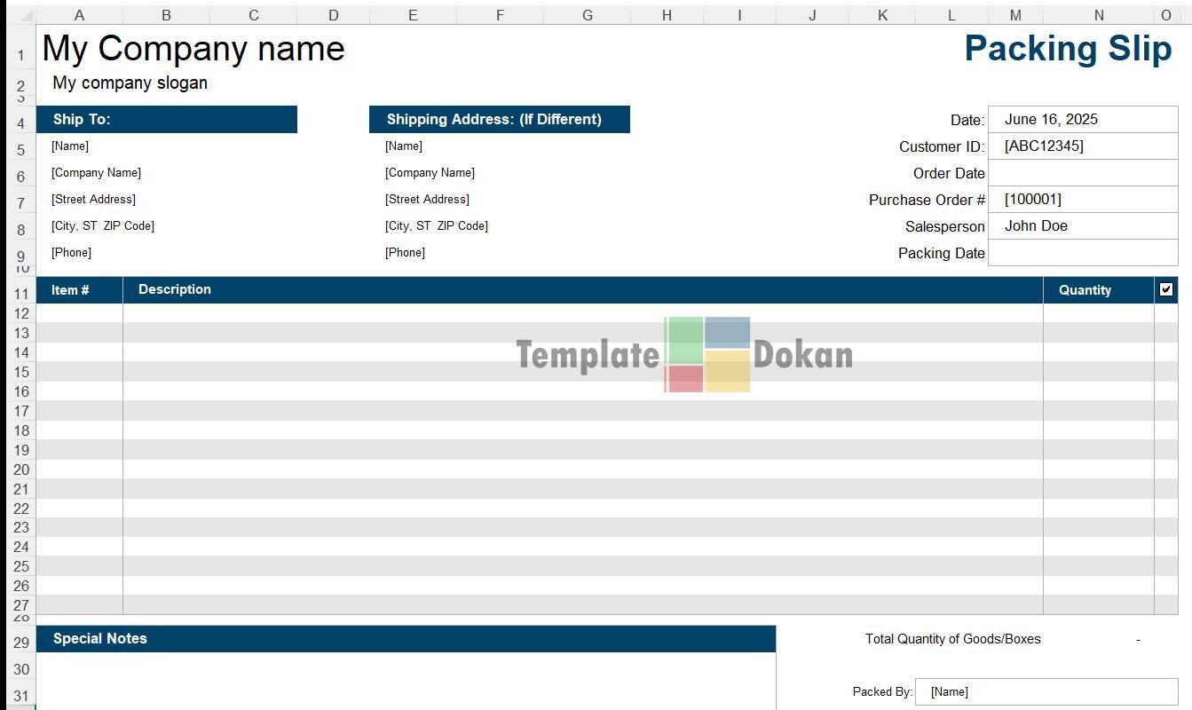 The Packing Slip Template is a fully customizable and editable Excel template. Perfect for professionals, students, or personal use, this template helps you stay organized and efficient. Easily printable and compatible with all modern versions of Excel.