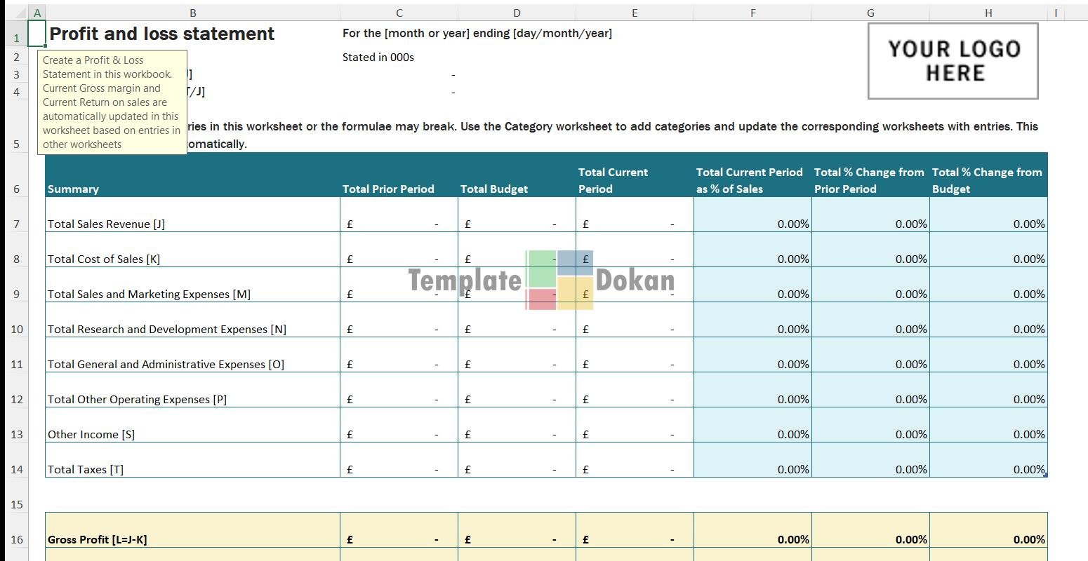Download this professionally designed profit and loss statement (with logo) to streamline your tasks in Excel.