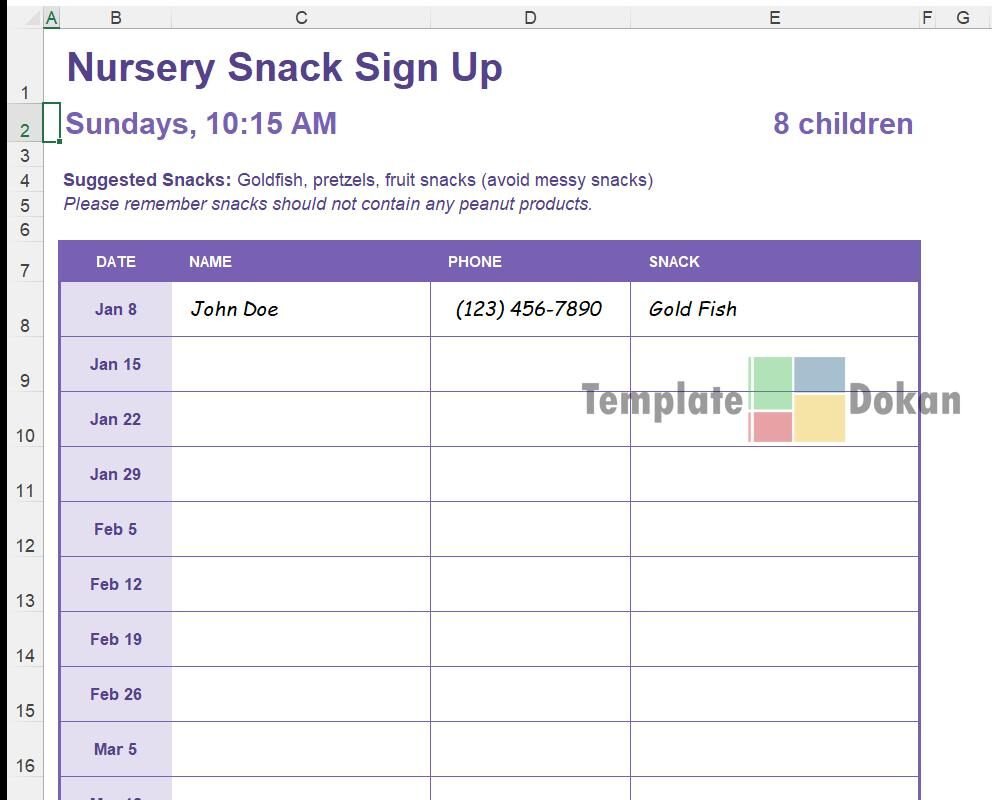 The Snack Sign Up Nursery is a fully customizable and editable Excel template. Perfect for professionals, students, or personal use, this template helps you stay organized and efficient. Easily printable and compatible with all modern versions of Excel.