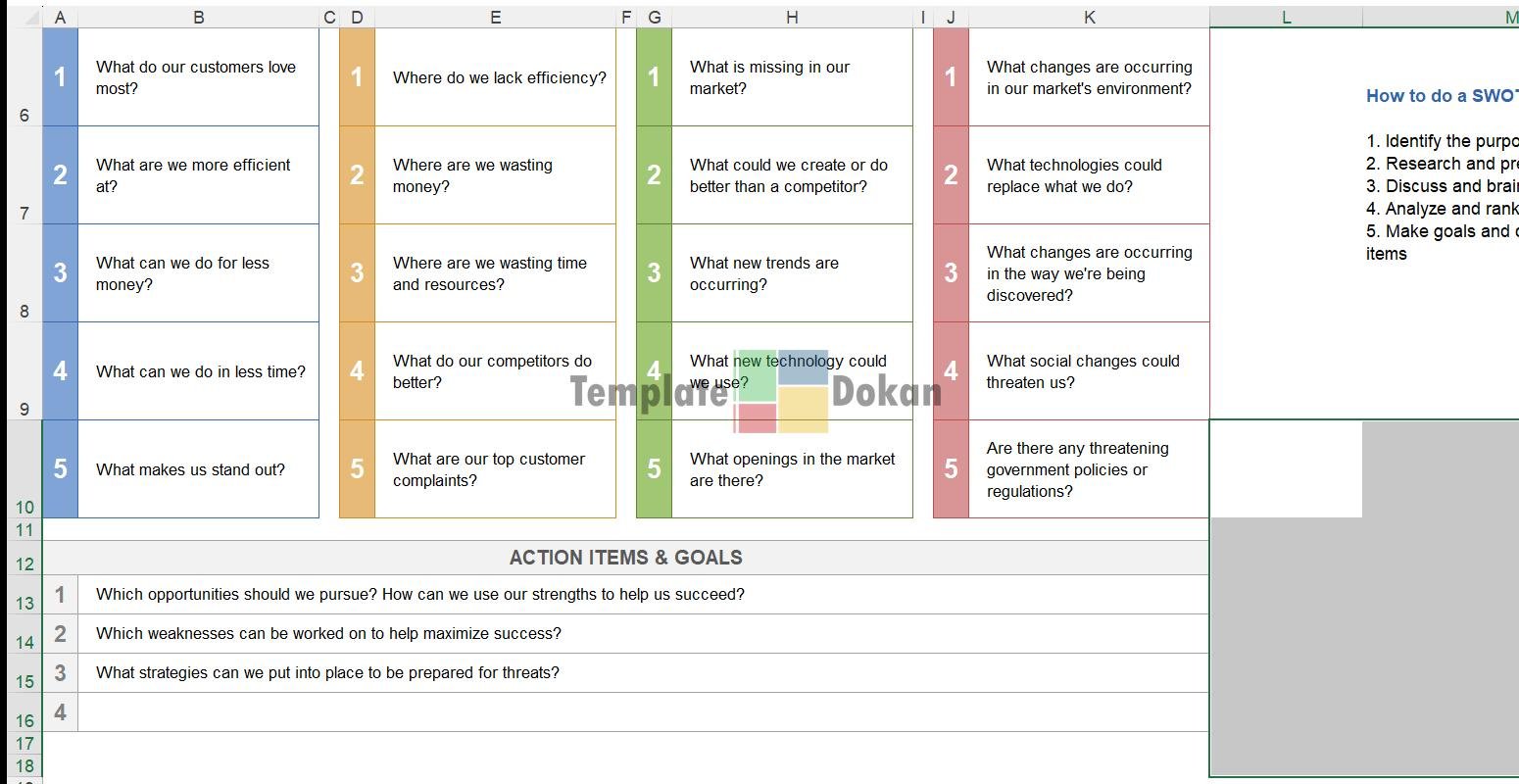 The Swot Analysis is a fully customizable and editable Excel template. Perfect for professionals, students, or personal use, this template helps you stay organized and efficient. Easily printable and compatible with all modern versions of Excel.