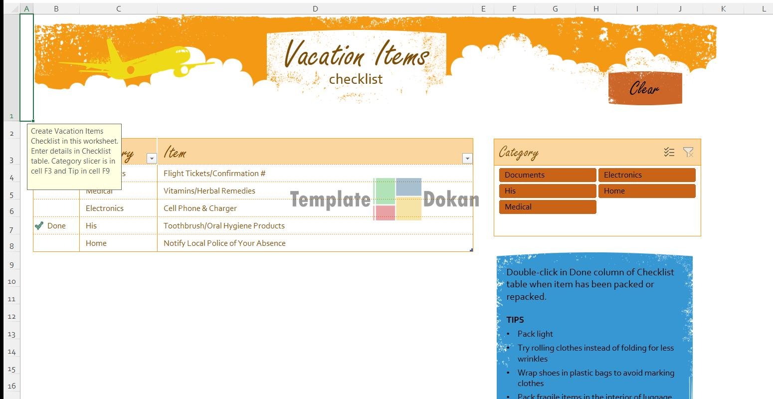The Vacation Items Checklist is a fully customizable and editable Excel template. Perfect for professionals, students, or personal use, this template helps you stay organized and efficient. Easily printable and compatible with all modern versions of Excel.
