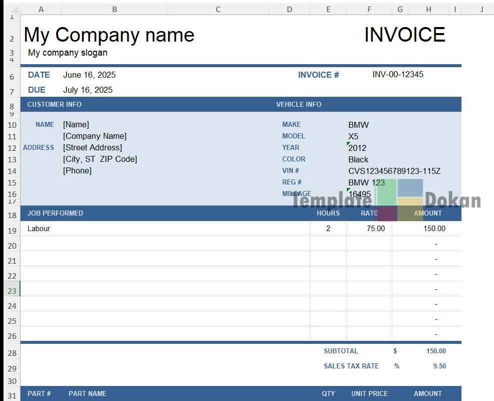 The Vehicle Repair Invoice is a fully customizable and editable Excel template. Perfect for professionals, students, or personal use, this template helps you stay organized and efficient. Easily printable and compatible with all modern versions of Excel.