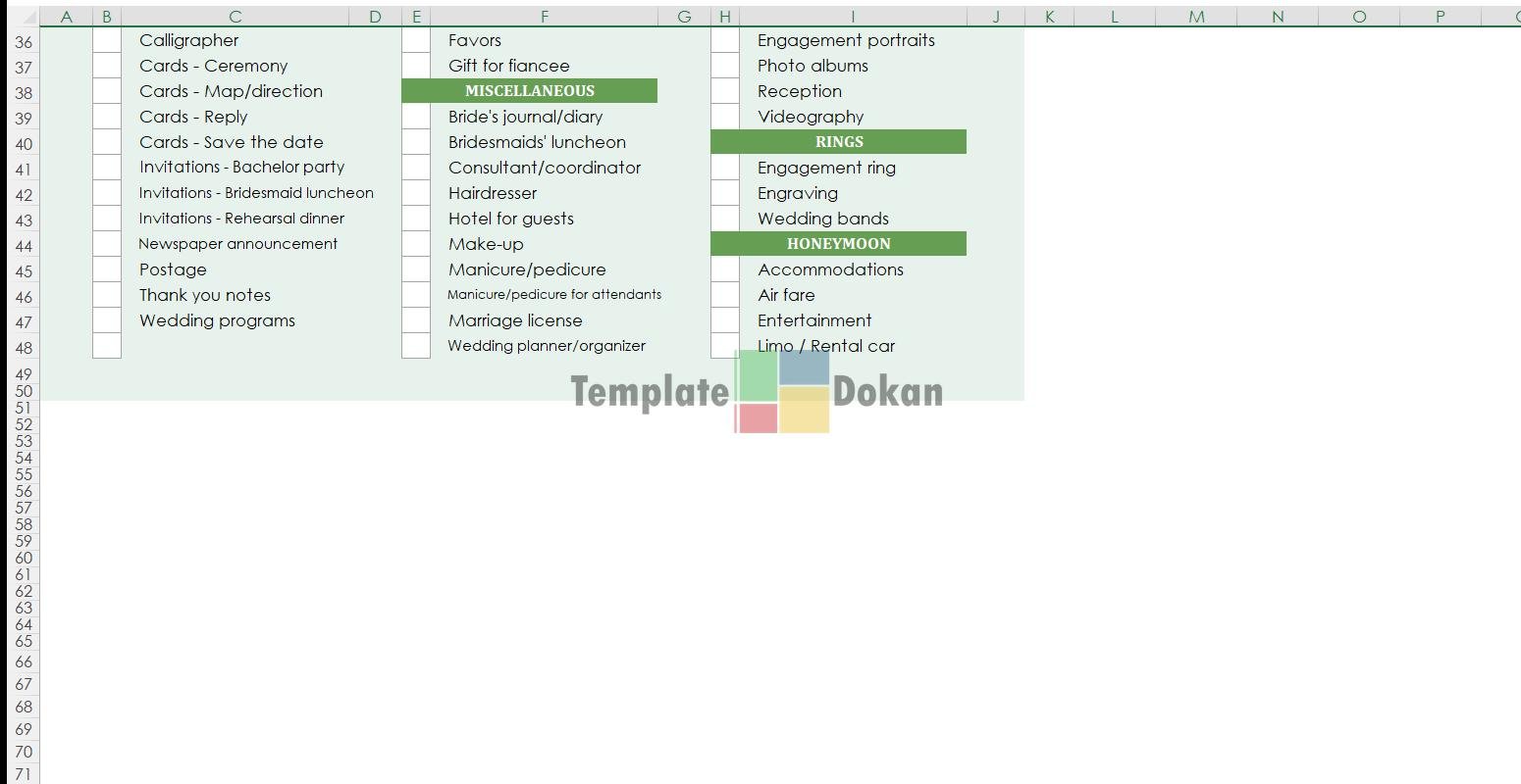 The Wedding Checklist is a fully customizable and editable Excel template. Perfect for professionals, students, or personal use, this template helps you stay organized and efficient. Easily printable and compatible with all modern versions of Excel.